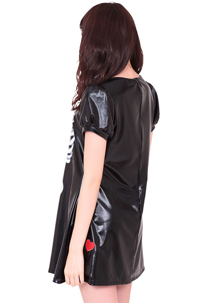 ●ツヤ感があるブラックカラー●ちょっぴりハードロックなAラインワンピース●スカートの部分にハート・クロスボーンズ・ゴシック調の十字架をプラス。