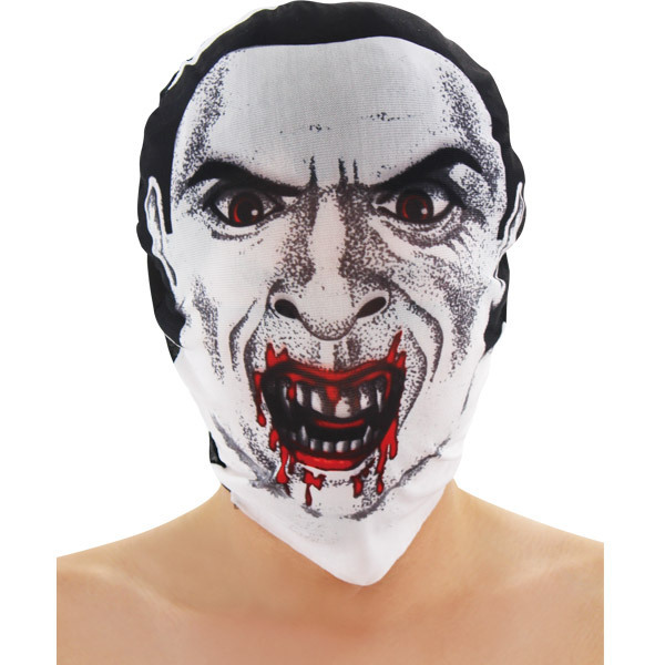 ●すっぽり被る布製のフルフェイスマスク(フリーサイズ)●歯をむき出して今にも噛みつきそうな男性の顔をプリント●血が滴る口元やギロッとにらんだ赤い目・顔の陰影を点で描写して気持ち悪さを演出。