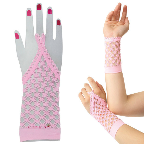 ●指先が見えるフィンガーレス●中指に通す指掛けタイプ●ピンクメッシュデザイン●伸縮素材でしっかりフィット。