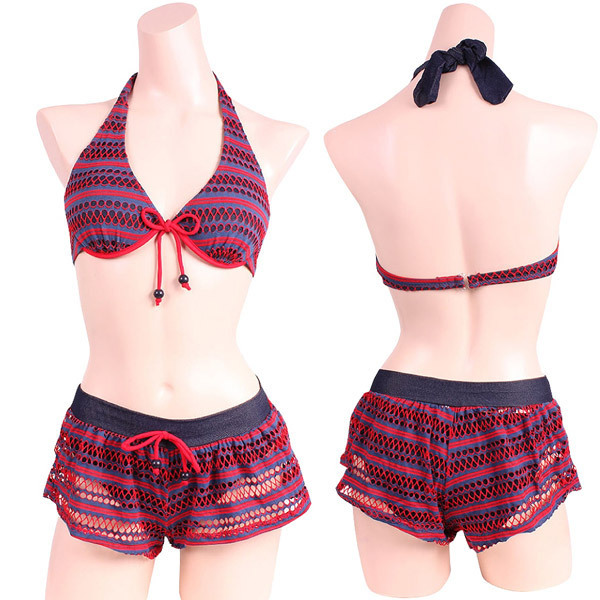 ビーチで周りと差をつける、赤とネイビー本格スイムウェアシリーズ♪ショートパンツありなしで2テイスト楽しめる3点セット。