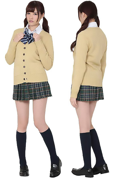 ホワイトカラーのブラウスに、COOLなベージュカラーカーデと落ち着いたグリーンカラーのチェック柄プリーツスカートがとっても可愛い制服コスチューム!ブルーカラーのストライプ柄リボンも付いた、これ1つでトータルコーデバッチリな4点セット。