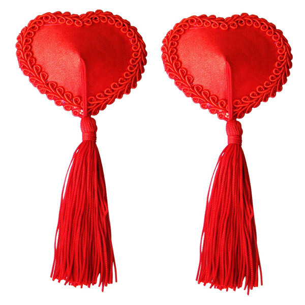 上品な光沢感のサテンを美しい装飾で縁取ったハート型ニップルと、ゆらゆら揺れるタッセルを組み合わせたゴージャスなデザインは、ショータイムやナイトパーティーにも最適です。