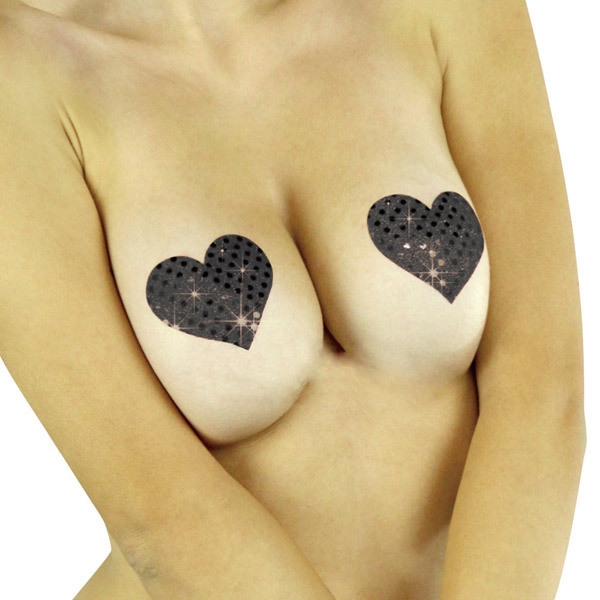 ピタッと貼るだけの簡単仕様♪バストトップに貼るだけで、セクシーな大人の雰囲気を醸し出す下着感覚のニップルジュエリー「ニップルシール ドットハート 黒」。