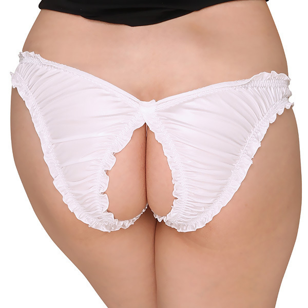 光沢感のあるフェリカ生地とレースのコンビ生地で縫製された日本製ショーツ♪ローライズ仕様で既にセクシーさを感じさせていますが、なんとクロッチ部分とお尻部分を大胆にカットしており、どこから見てもエロさを感じさせるデザインとなっています。