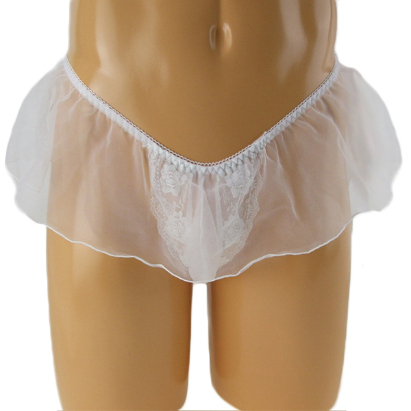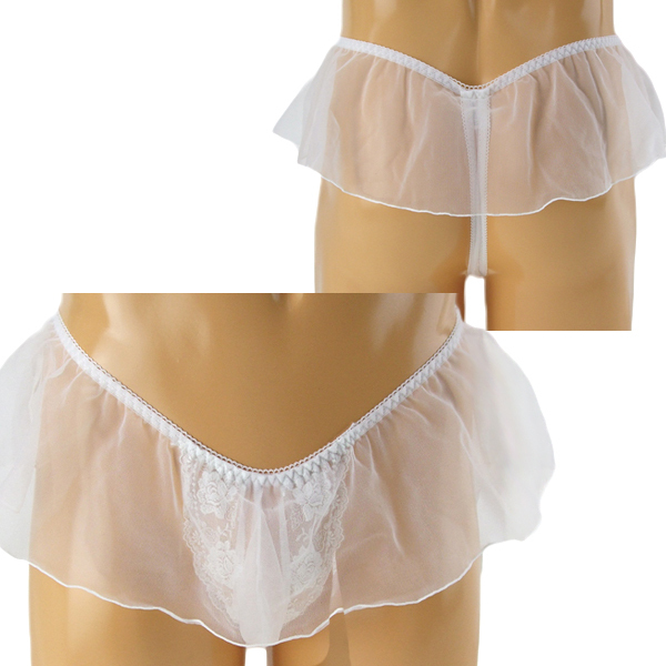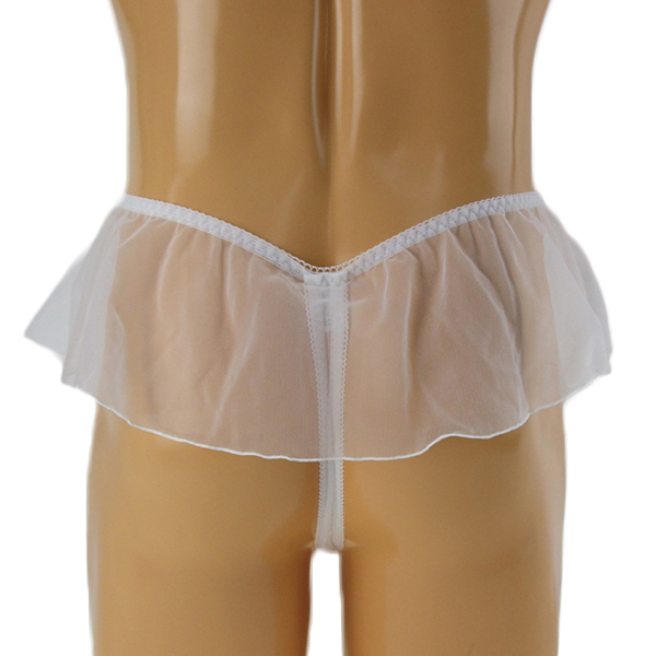 > メンズ シースルースカート付きレース刺繍Tバック (ホワイト)