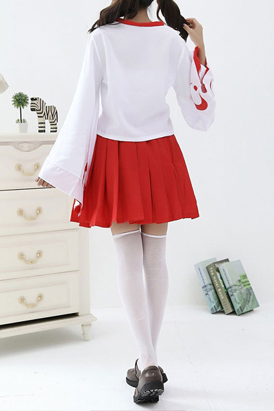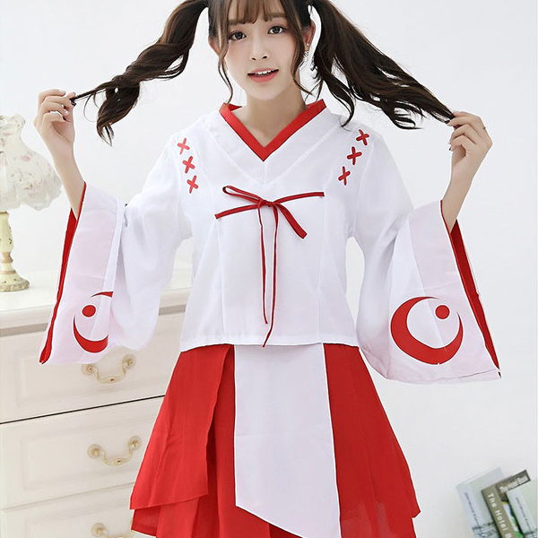 袴風のミニ丈プリーツスカートと白衣の赤いリボンがとってもフェミニン♪振袖部分の月模様がミステリアスな印象を与える巫女風コスプレ。