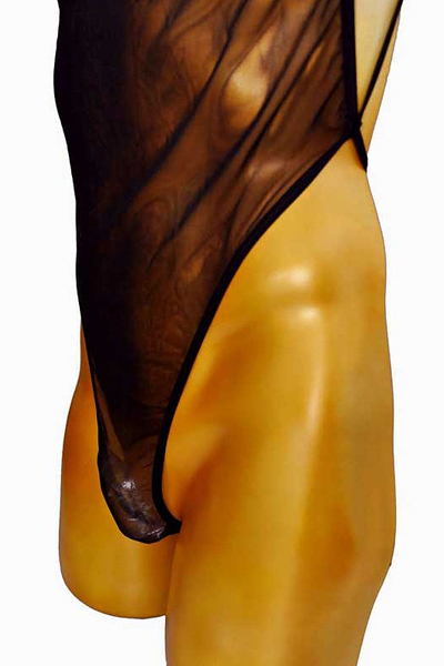 筋肉美を際立たせるシアー素材を使用した黒の男性用ボディストッキング。