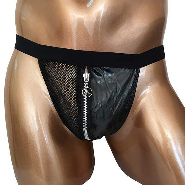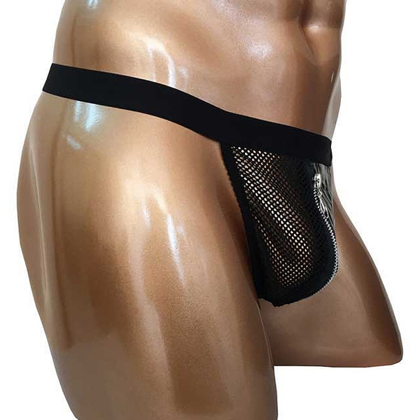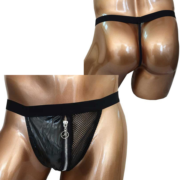 太目の黒ゴムでウエストをしっかりホールド!バックは紐状のストリング仕様で、フロントは黒地とメッシュ素材をジッパーでつなぎ合わせたお洒落なデザイン。