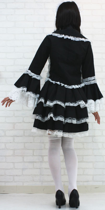 Mサイズ:B76〜82cm・W64〜100ccm 丈:上着48cm(袖62cm・肩幅37cm)・スカート47cm セット内容:ジャケット(前ボタン留め、姫袖)・別衿・ヘッドドレス(総レース仕様、バラのコサージュ付き)・スカート(ウェストゴム入り)