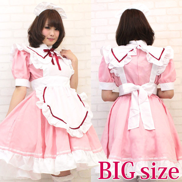 BIGサイズ:B92〜110cm・W90〜100cm 丈:ワンピース91cm(肩幅:43cm、袖丈31cm、袖口38cm)・エプロン83cm セット内容:ワンピース(ウエストゴム入り、後ろファスナー)、エプロン、カチューシャ