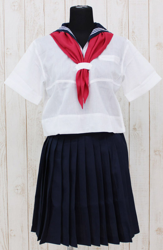 ●切り替えが珍しい白の半袖トップス●首元が詰った紺色セーラー襟で真面目感アップ●襟元よりかなり下方にスカーフ留めを配置●一部ゴム入り・ウエストにフィットする膝丈紺色プリーツスカート。