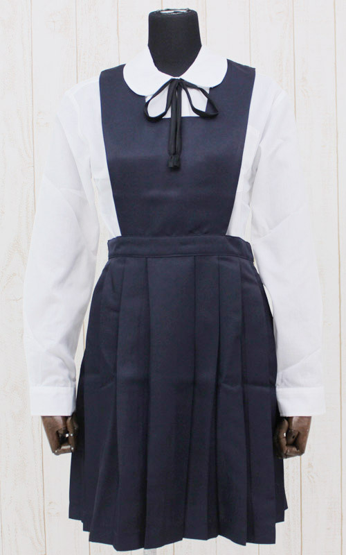 ●着脱簡単な肩ボタン付きジャンパースカート●可愛らしい丸襟の長袖ブラウス●丸襟と相性バツグンの紐タイ。