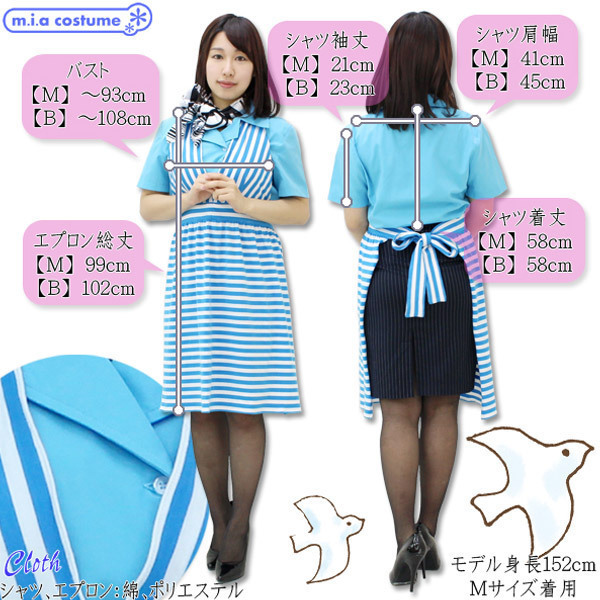 Mサイズ シャツ:B〜93cm・肩幅41cm・袖丈21cm・着丈58cm ジャケット:B〜90cm・肩幅40cm・袖丈58cm・着丈53cm スカート:W〜72cm・H〜89cm・着丈53cm エプロン:総丈99cm スカーフ:89×89cm セット内容:シャツ、ジャケット、スカート、エプロン、スカーフ
