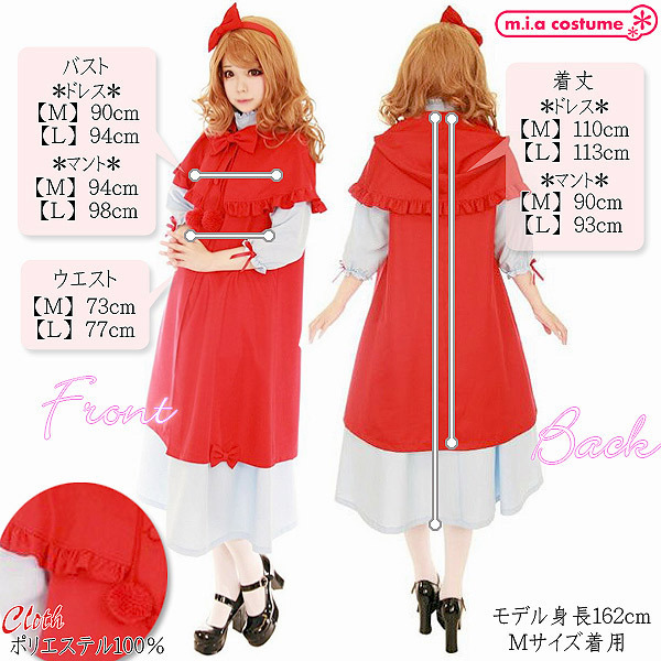 Mサイズ:ドレス(B90cm・W73cm・着丈110cm)・マント(B94cm・着丈90cm) セット内容:ドレス(後ろファスナー)、マント(前ボタン)、カチューシャ(ブローチピン付き)、ボンボン付きリボン 素材:ポリエステル100%