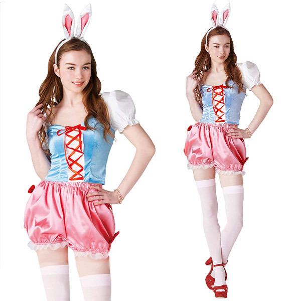 人生をワクワクさせるコスプレブランド「Newyork Wish」から登場!お尻に丸く真っ白な尻尾が付いたドロワーズのサイドに真っ赤なリボンを2つ飾り付け、パステルカラーで華やかに仕上げた兎カチューシャ付きのハロウィン仮装。
