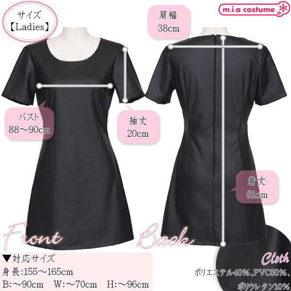 対応サイズ:身長155〜165cm・B〜90cm・W〜70cm・H〜96cm 実寸:B88〜90cm・肩幅38cm・袖丈20cm・着丈81cm セット内容:ワンピース単品(背中心ファスナー) 素材:ポリエステル40%、PVC50%、ポリウレタン10% モデル身長155cm