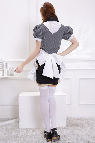 Mサイズ(平置き):トップスB43cm・着丈51cm・肩幅43cm・袖丈19cm スカート丈52cm・W32〜38cm セット内容:トップス(サイドファスナー)、スカート(ウェストゴム入り・背面ファスナー、パニエ一体型)、エプロン、カチューシャ、ネクタイ(ゴムバンド仕様)